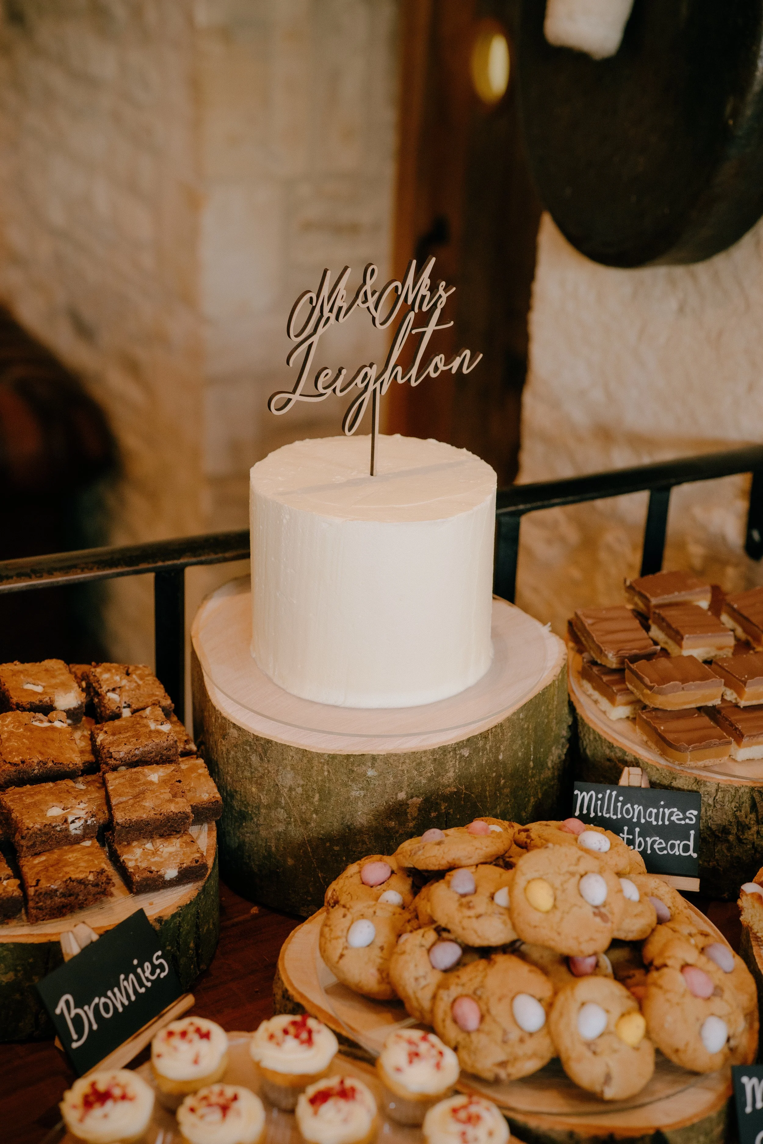 Many couples also pair their cake with dessert tables, giving guests more choice while keeping the main wedding cake Cotswolds design as a focal point.